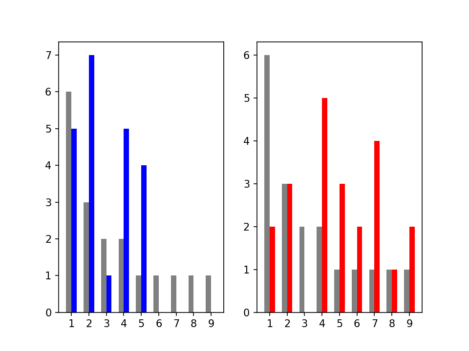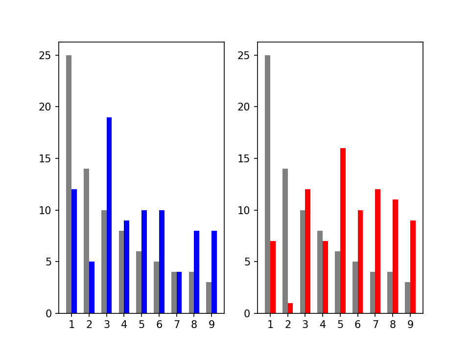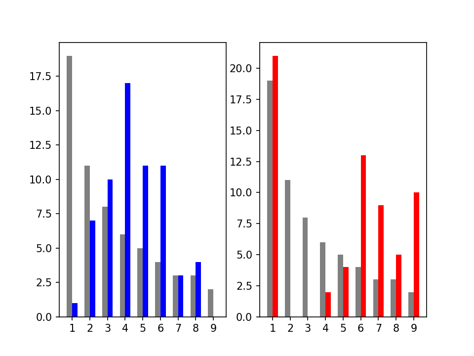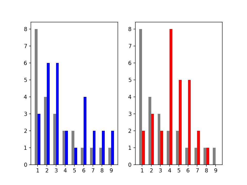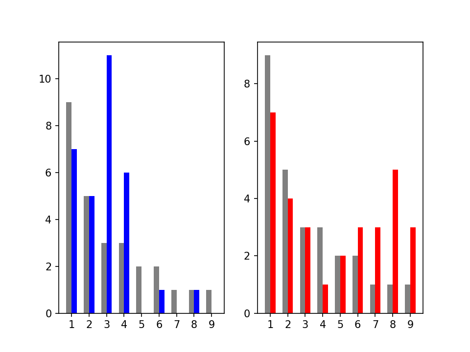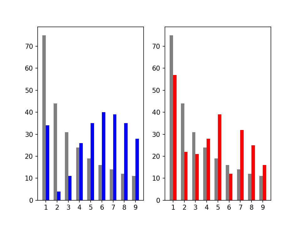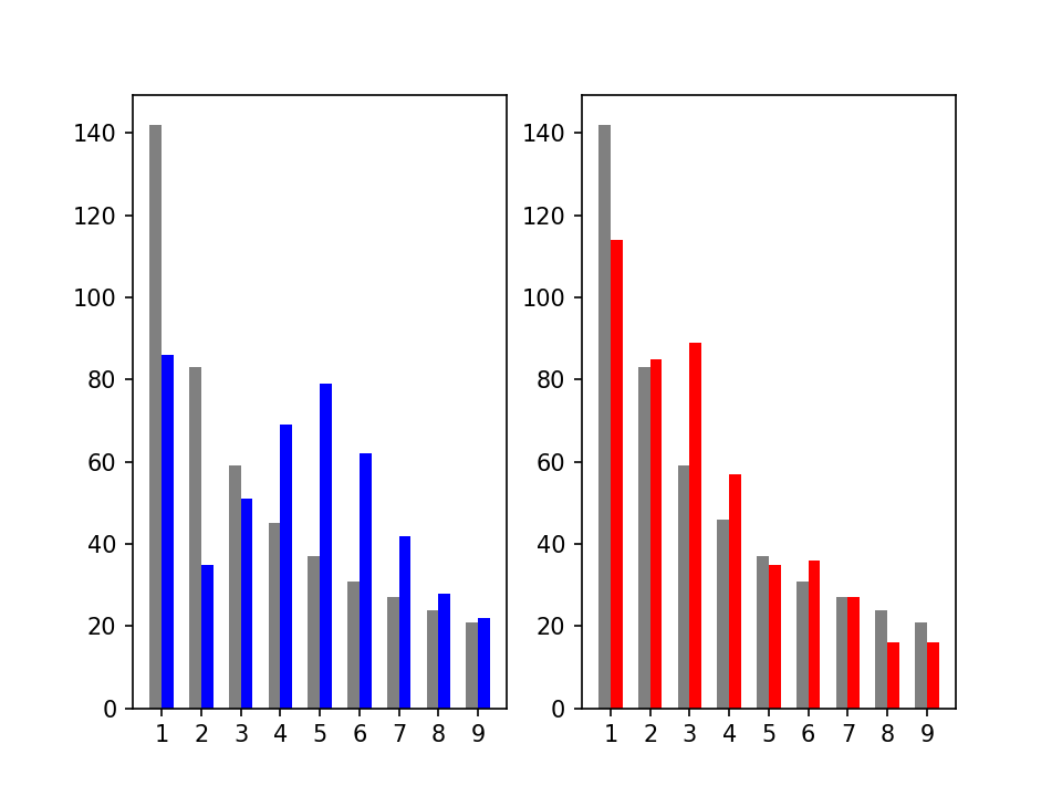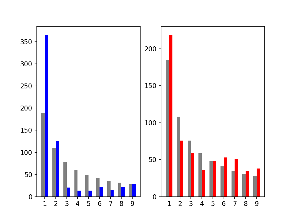 The gray bars show expected values under Benford's Law. The blue shows Biden votes, and the red shows Trump votes.