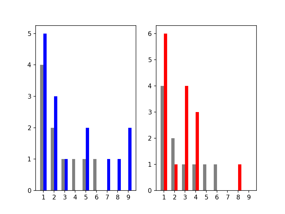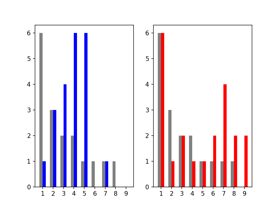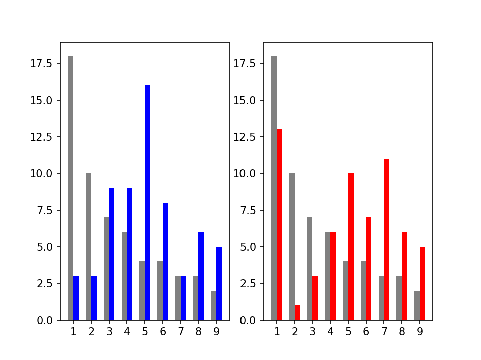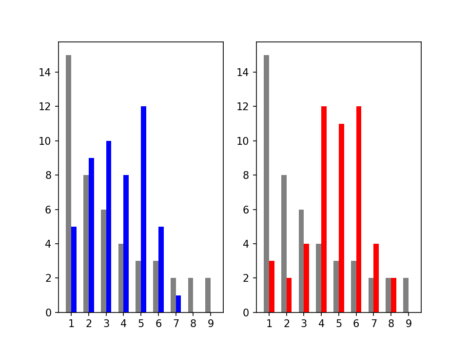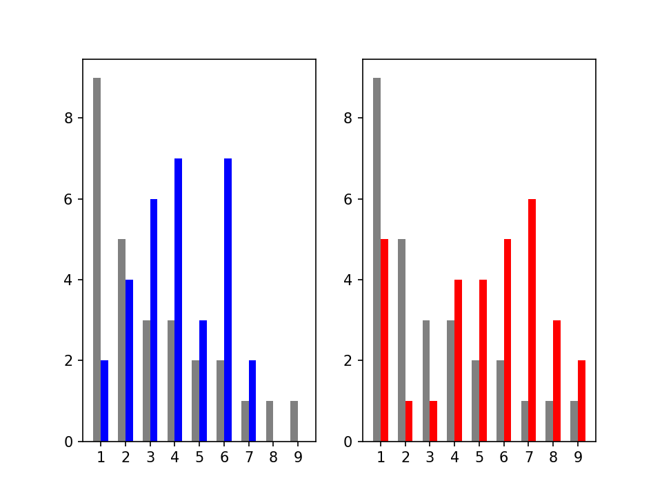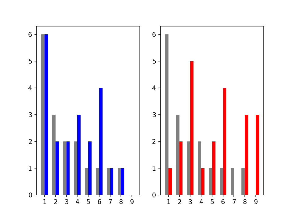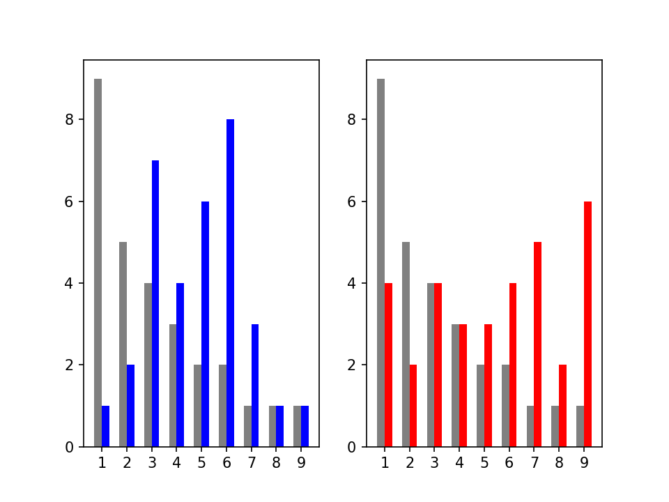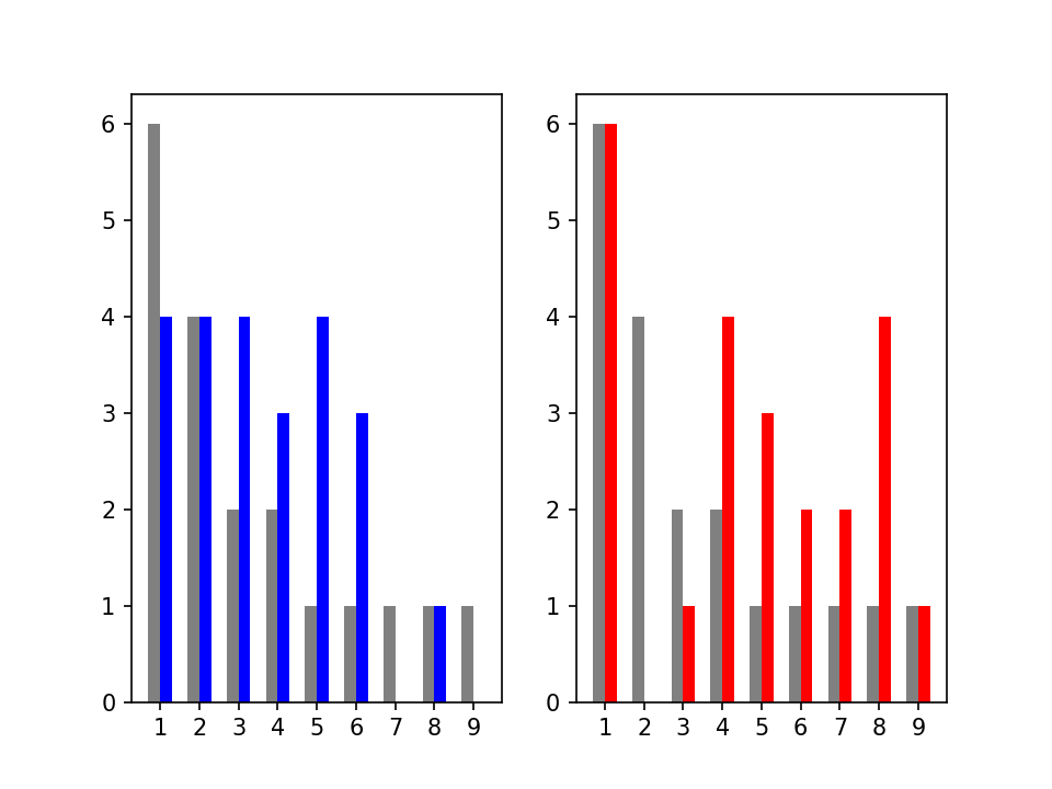 The gray bars show expected values under Benford's Law. The blue shows Biden votes, and the red shows Trump votes.